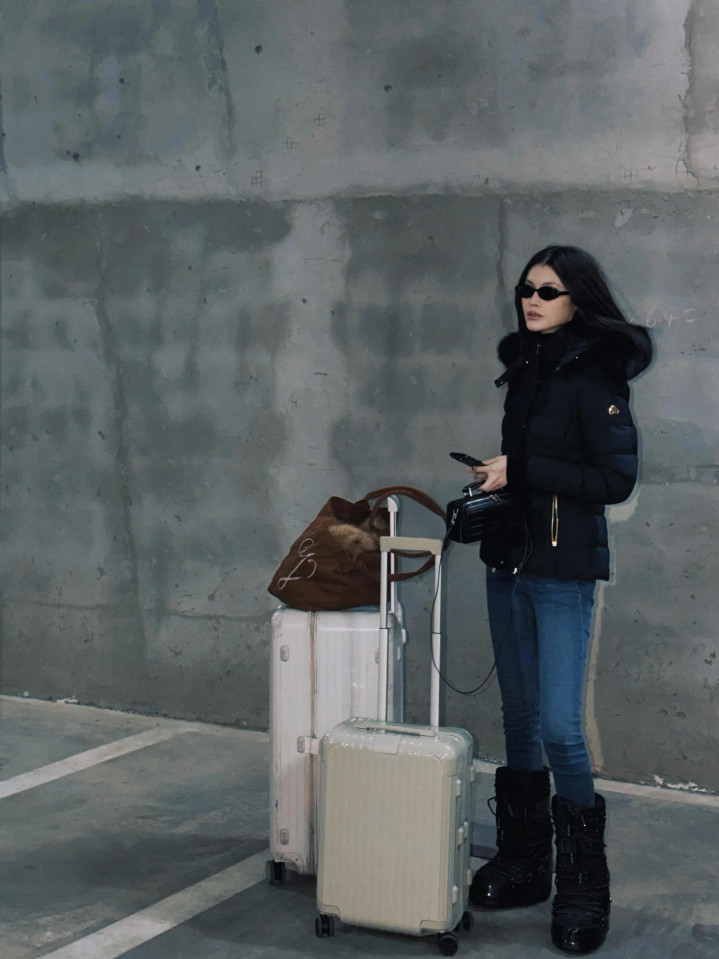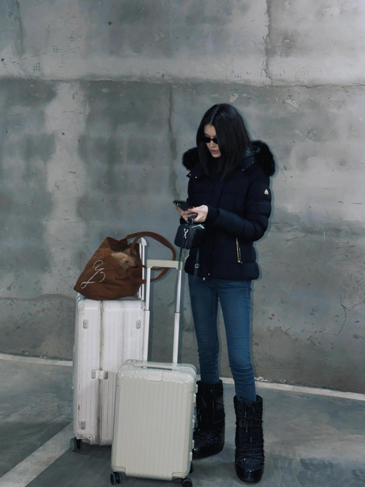 虽然何穗刚生完孩子不久,但她已经开始工作了,她拿着行李箱到处飞,太敬业了。何穗穿着黑色毛领羽绒服搭配蓝色紧身牛仔裤,脚上穿着一双黑色的滑雪雪地靴,这身穿搭太时髦漂亮了,她的衣品真好。