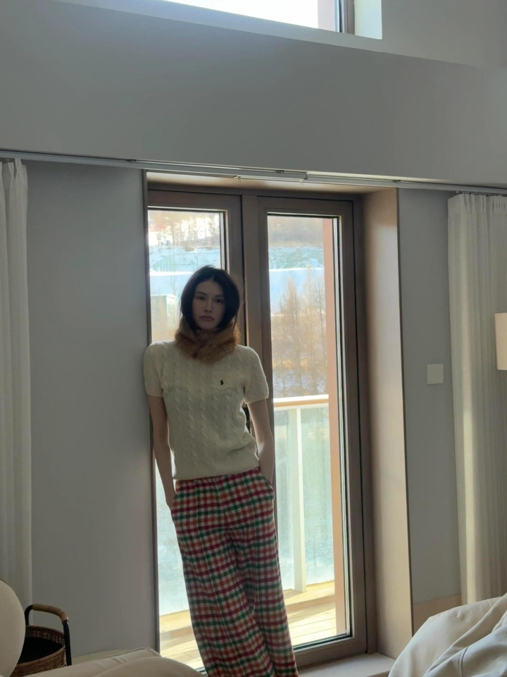 何穗穿着拉夫劳伦短袖毛衣,搭配了一条彩色格纹裤子,戴着毛领围巾,这身穿搭好漂亮,被种草了这条格纹裤子,配色真好看。