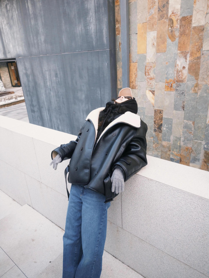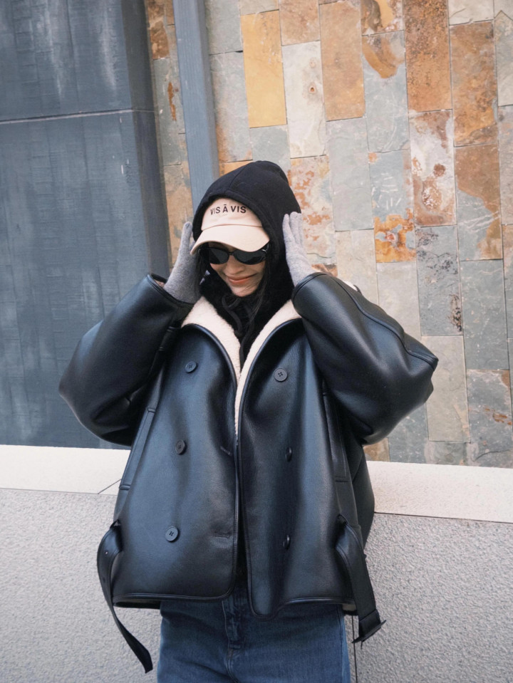 何穗的冬装穿搭很耐看,她用黑色皮衣皮毛一体搭配黑色连帽卫衣,硬朗帅气又很保暖。