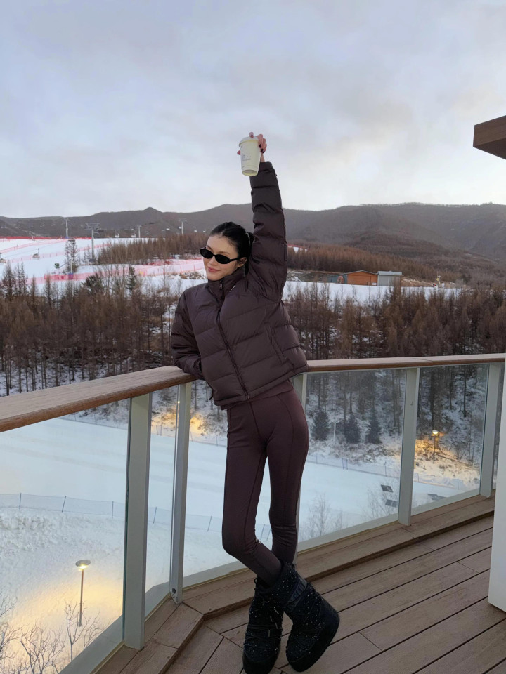 何穗还去滑雪了,她穿着瑜伽裤身材纤瘦,她的三角区也不明显,身材好极了。何穗高举着咖啡,享受着滑雪的快乐时光。