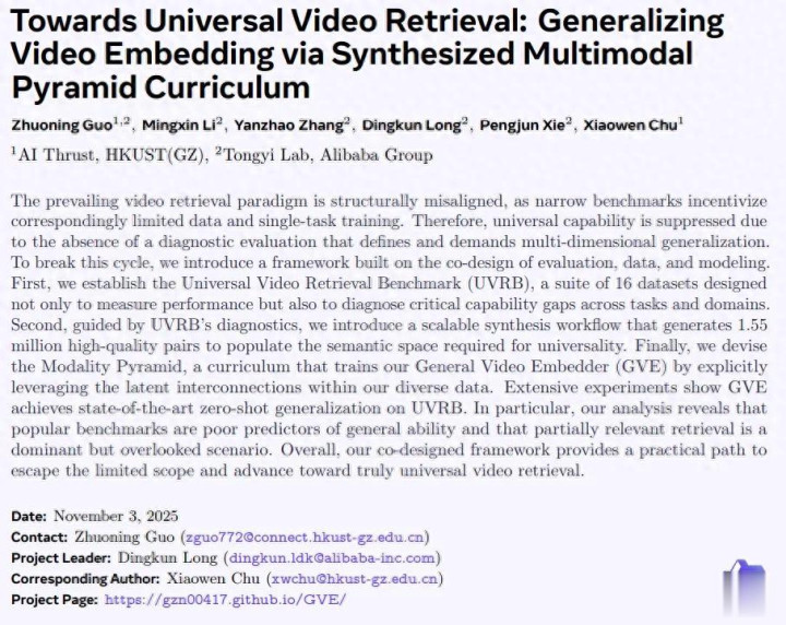 研究团队已开源GVE系列模型及UVRB基准,推动社区从”刷榜竞赛”转向”能力诊断”与”可用性拓展”,并希望这项工作不仅带来性能最强的视频嵌入模型,更为视频检索从”窄域专用”迈向”通用智能”奠定方法论基础。