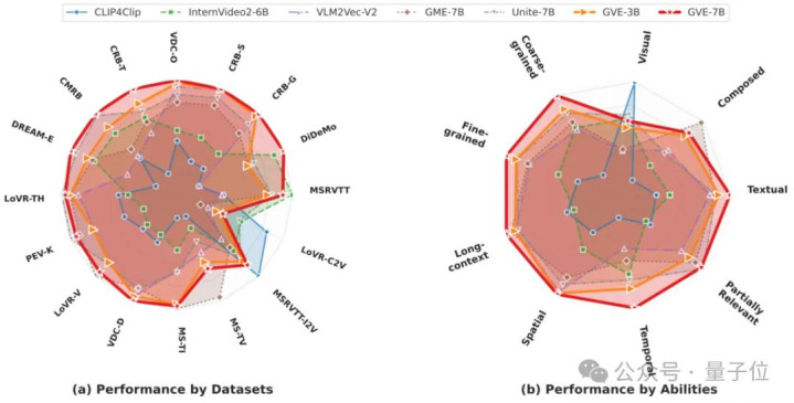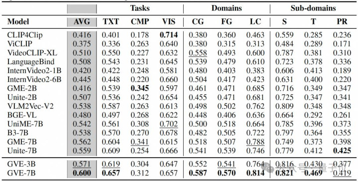 由此推出的通用视频嵌入模型GVE(含3B与7B两个版本),在严格零样本设置下全面超越现有14个主流模型,展现出卓越的泛化能力。