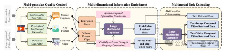 基于原始视频检索数据,团队设计 V-SynFlow 流程进行三阶段数据增强与合成: