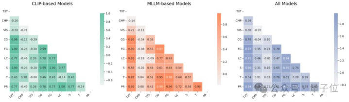 研究发现,模型架构深刻影响其能力基因。CLIP系模型在粗粒度空间任务上近乎完美(相关性0.99),却在时间维度上先天不足;更令人意外的是,它们在组合语义理解越强,纯视觉匹配反而越弱(负相关-0.71)。