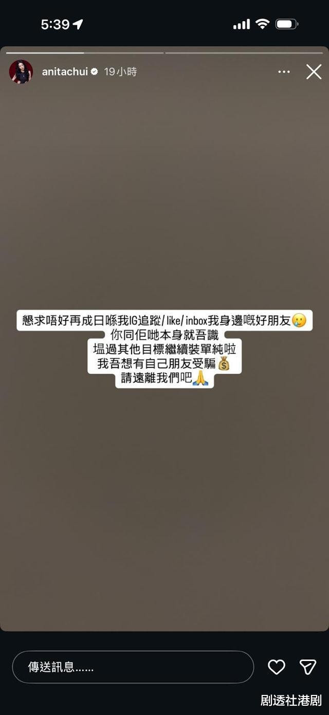 谁知道之后剧情峰回路转,崔碧珈在社交平台上发文,疑似炮轰有人是在装单纯,并且把目标对准了自己身边的朋友,崔碧珈更发文表示希望对方可以远离他们,在这件事之后,二人的关系可以说是正式决裂。
