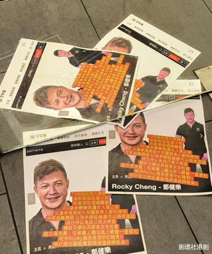 从曝光出来的照片中,可以看到海报中是用了郑健乐在TVB资料页的照片,并且指出了郑健乐有吃软饭、欠债、破产等等罪名。