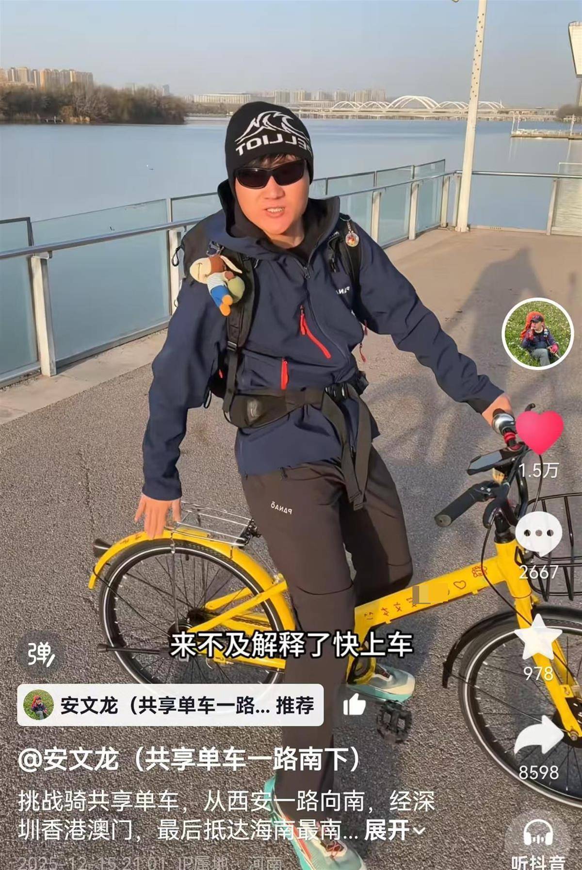 近日,陕西西安男子安文龙一路骑报废小黄车南下,半个月已经骑行超过1700公里,目前已抵达广东。28日,安文龙回应极目新闻记者称,他之前是徒步爱好者,今年开始尝试骑单车,挑战自己,此次一路向南计划总行程3500公里,再从海南返回。
